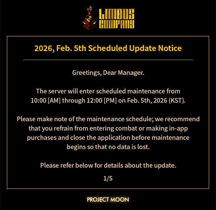 arrow-up13arrow-down1image[Limbus News] 2026, Feb. 5th Scheduled Update Noticeplus-squareclan.fastly.steamstatic.comLeGaosaure@lemmy.cafeMEnglish · 8 days agomessage-square0linkfedilink
